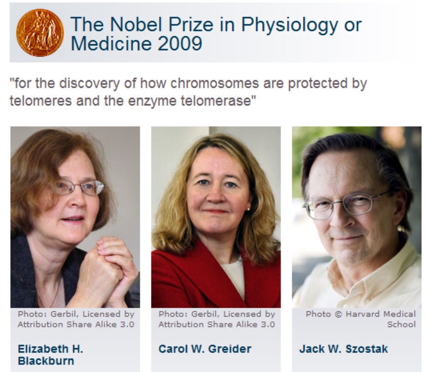 Το 2009 το Νόμπελ Ιατρικής απονεμήθηκε σε 3 επιστήμονες - E. Blackburn, C. Greider, J. Szosak - για τις ανακαλύψεις τους στη βιολογία των τελομερών και στους μηχανισμούς γήρανσης του ανθρώπινου οργανισμού.